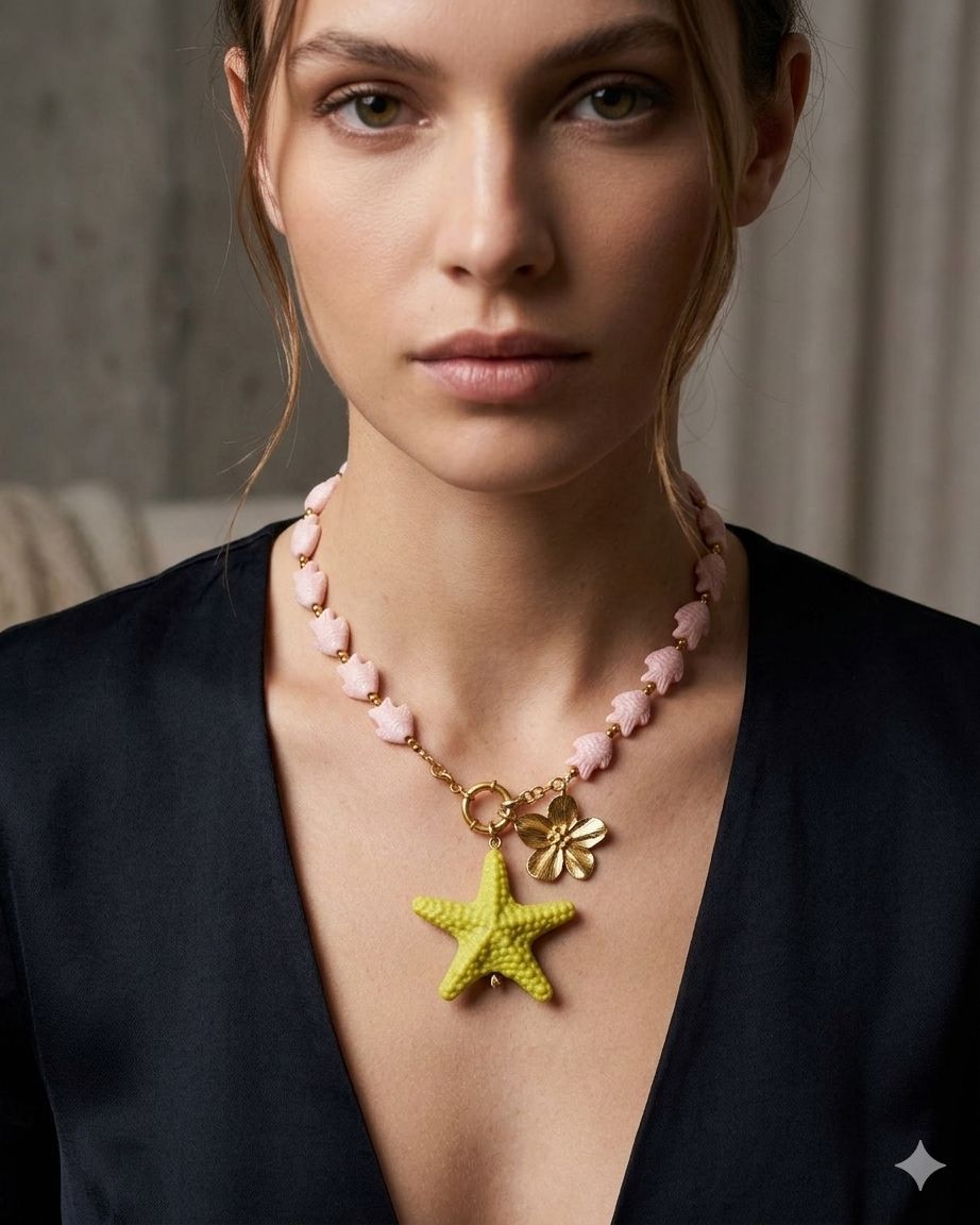 Collar hecho a mano dijes en cerámica diseños marinos, estrella de mar en acrílico dije y broche dorado en bronce con baño de oro 18kl