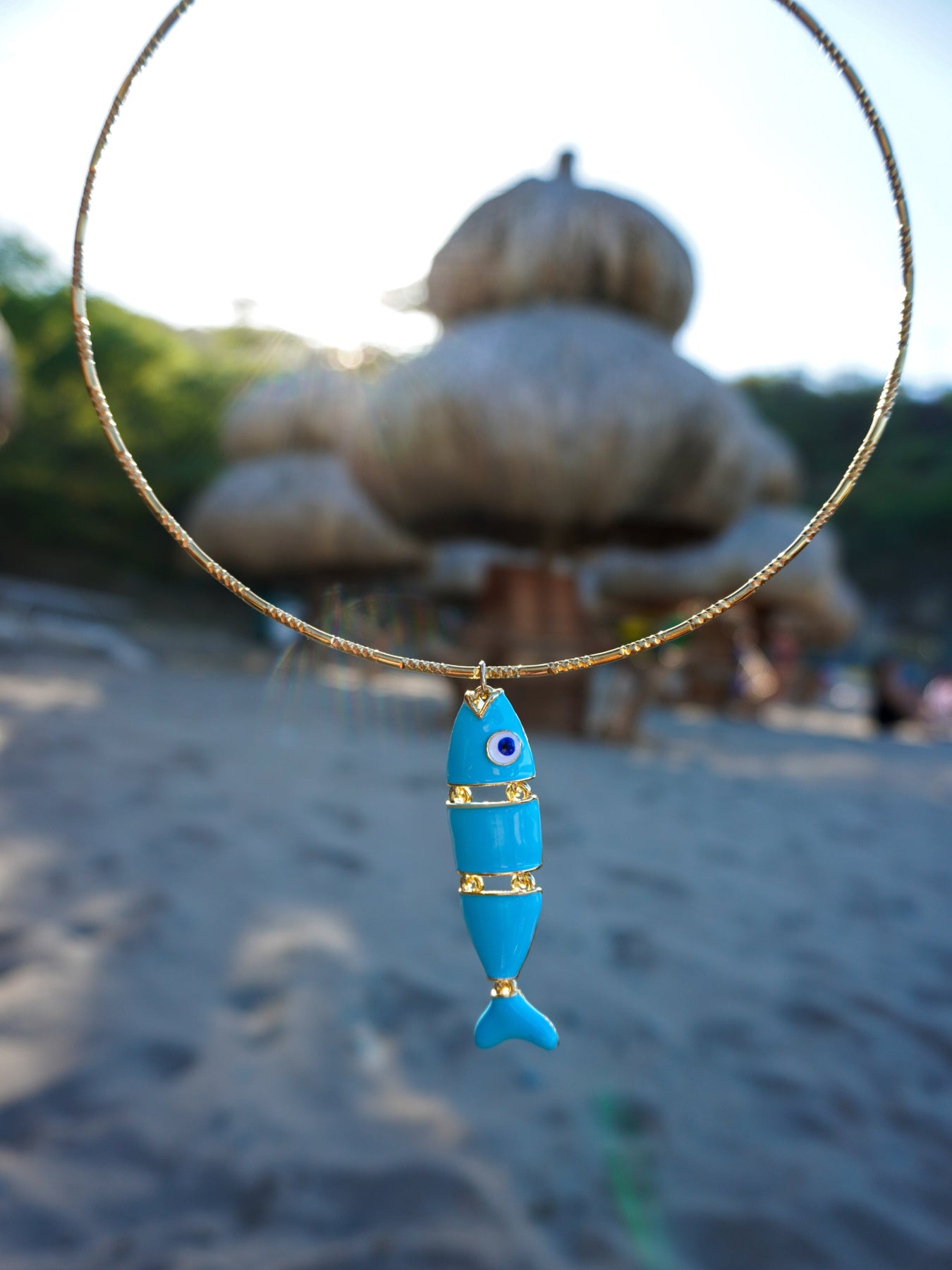 Este collar está elaborado en acero inoxidable con un elegante aro dorado, acompañado de un delicado dije de pez en colores.