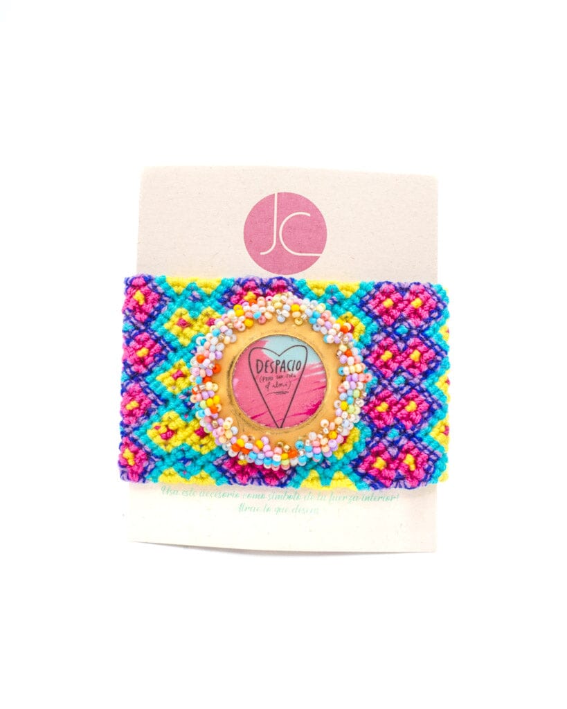 Cada pulsera es tejida a mano en Colombia por artesanos indígenas de las comunidades Wayúu, utilizando técnicas ancestrales transmitidas de generación en generación.