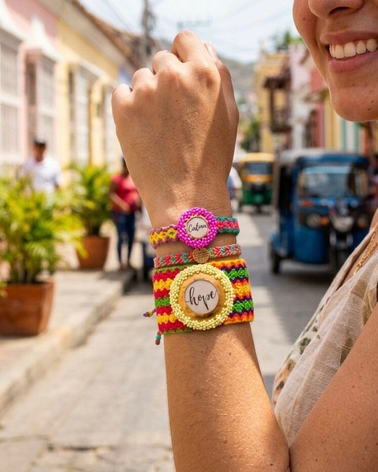 Cada pulsera es tejida a mano en Colombia por artesanos indígenas de las comunidades Wayúu, utilizando técnicas ancestrales transmitidas de generación en generación.